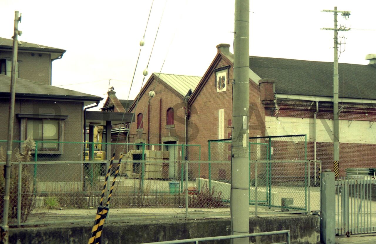 煉瓦の壁面の一部は大きく開けられ、シャッターが設置されてますが、おおむね当時の姿を保っていたと思います。京福電気鉄道の施設と言えば渦巻マークの社章がついてたりするのですが、この車折変電所には見当たりませんでした。記憶は曖昧ですが、私が京都に帰還した2001年頃にはもう無くなってた記憶なので、2000年頃に取り壊されたものと思われます。現在は変電所自体が無くなり、分譲住宅地となっています。