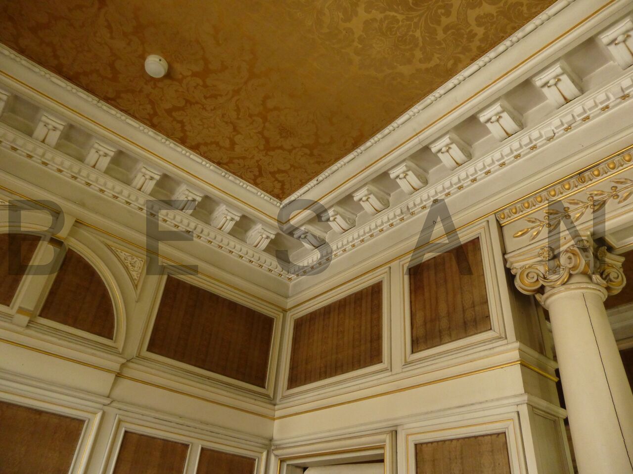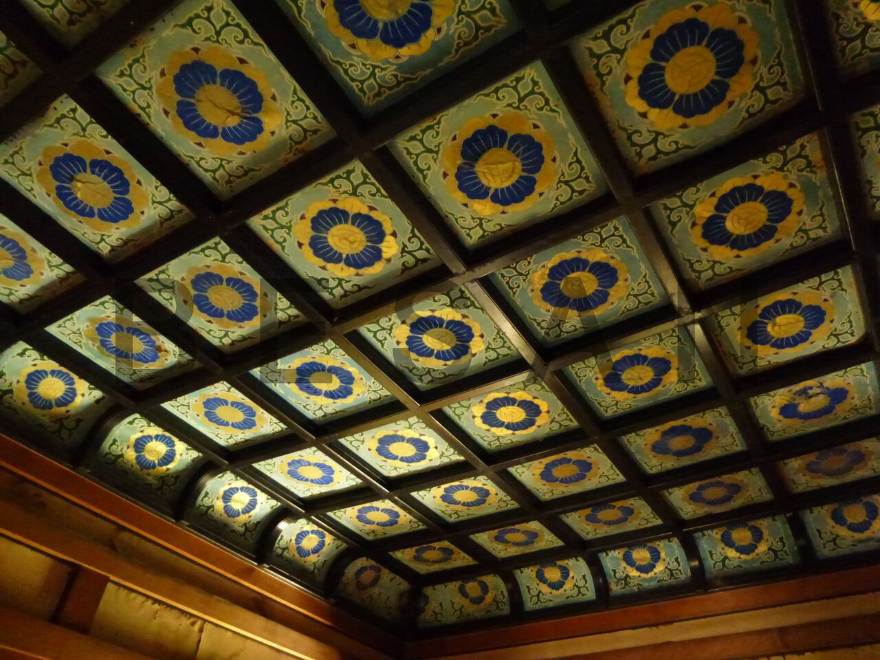 諸戸邸主屋の仏間の天井。一番格式のある部屋として使用されたようで、装飾を描き、漆塗りに仕上げた豪華な折上格天井。立ち合い時に撮影。