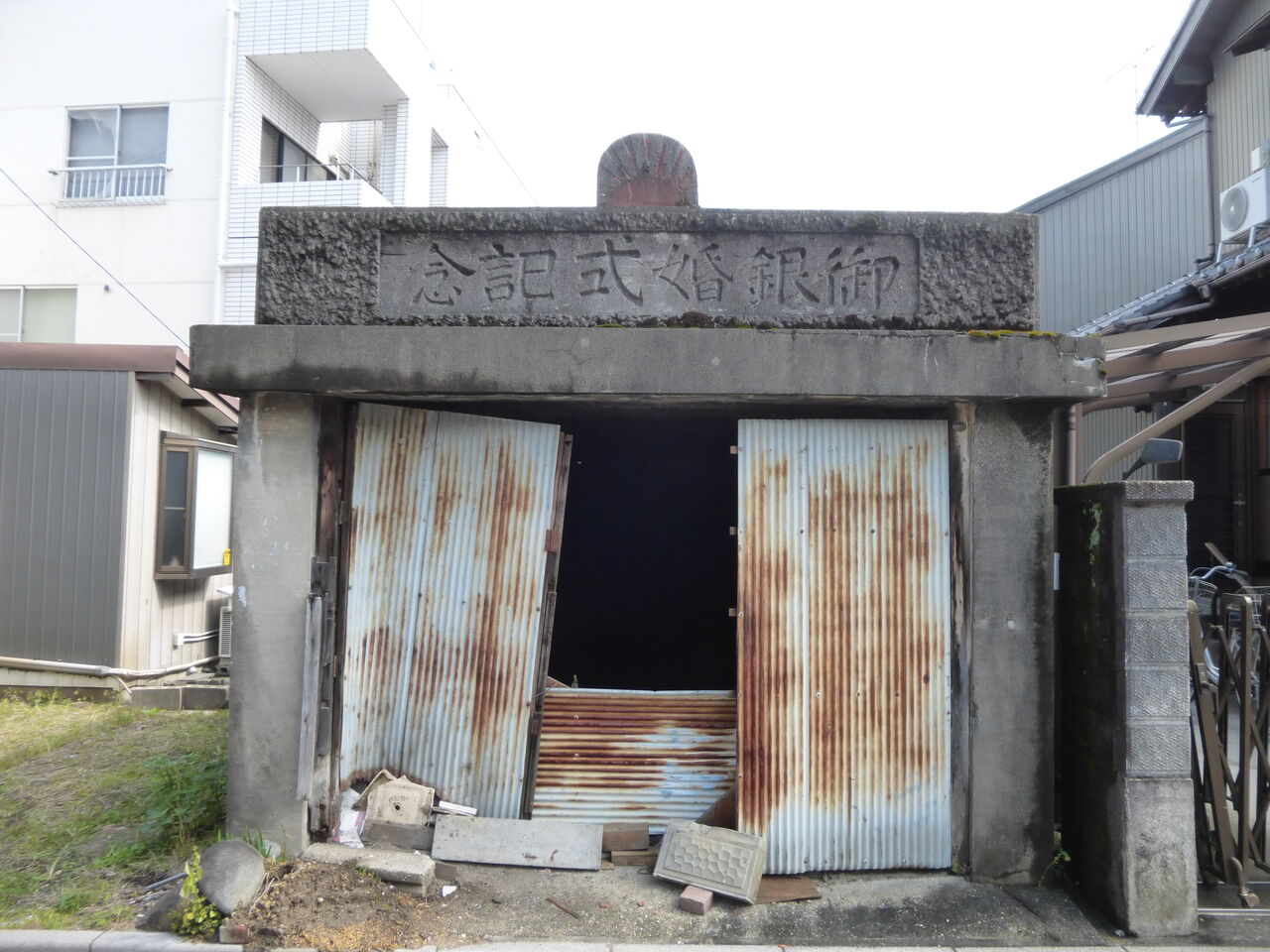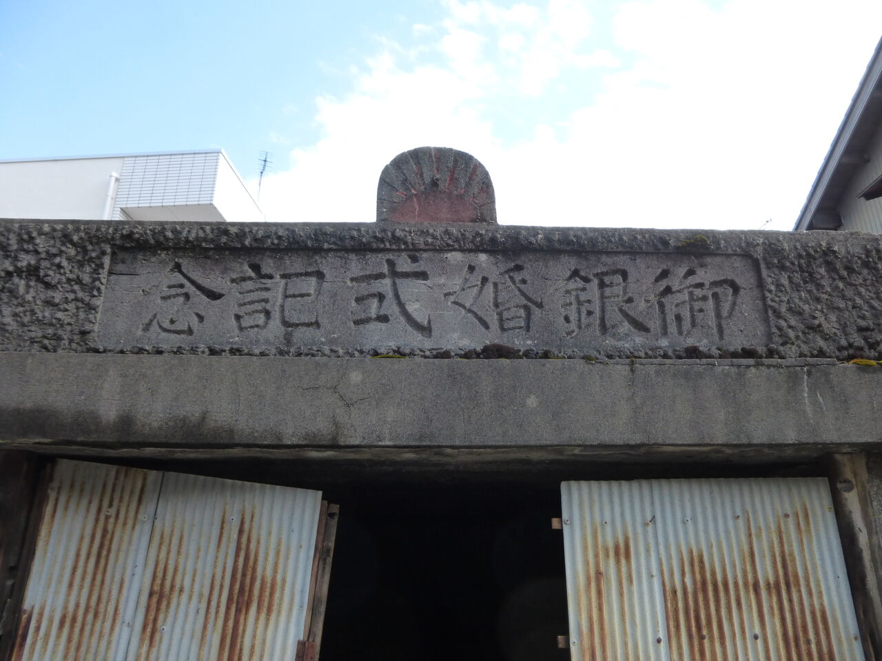旭日の文様と「御銀婚式記念」の文字が彫られたコンクリートの建物。