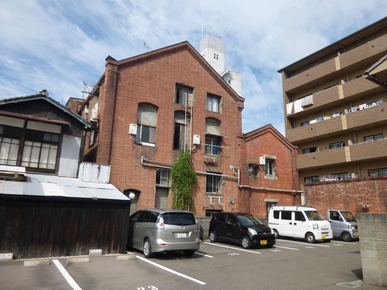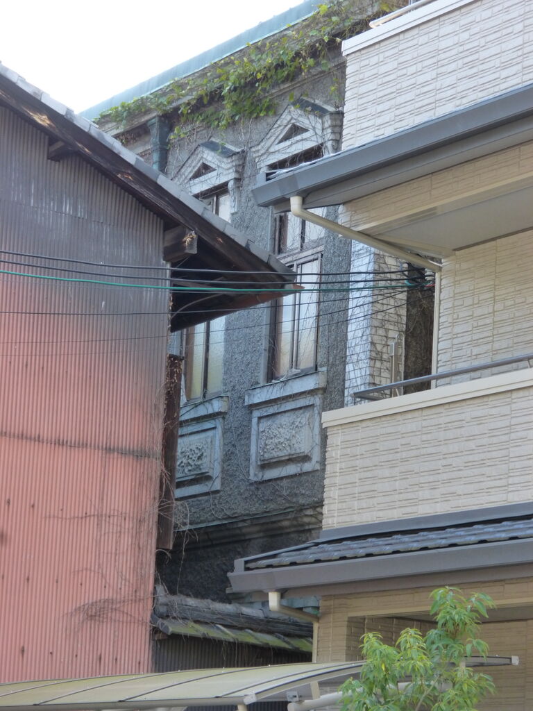 旧富岡鉄斎邸書庫(※現存せず)。薬屋町。大正期。明治・大正期の文人画家として知られる富岡鉄斎邸の洋館の書庫で、近年まで京都府議会議員公舎として京都府北部の府議会議員の宿舎として使用されていましたが、去年主屋と共に取り壊されたようです。一応、保存活用の案もあったようですが、著名人の邸宅でも取り壊されてしまうんですね。ちなみにこちらのブログに書庫内部の写真がありますが、宿舎として使用するためかなり改造されています。