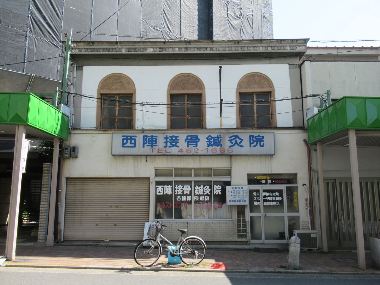 西陣接骨鍼灸院。三軒町。軒周りに凝った装飾のある建物。1階部分とかかつてはもっと装飾に富んでいたのかもしれません。