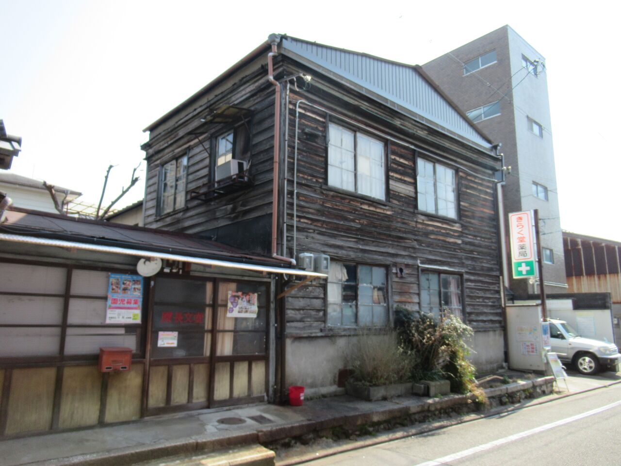 きらく堂薬局。大黒町。元は町工場の事務所でしょうか。