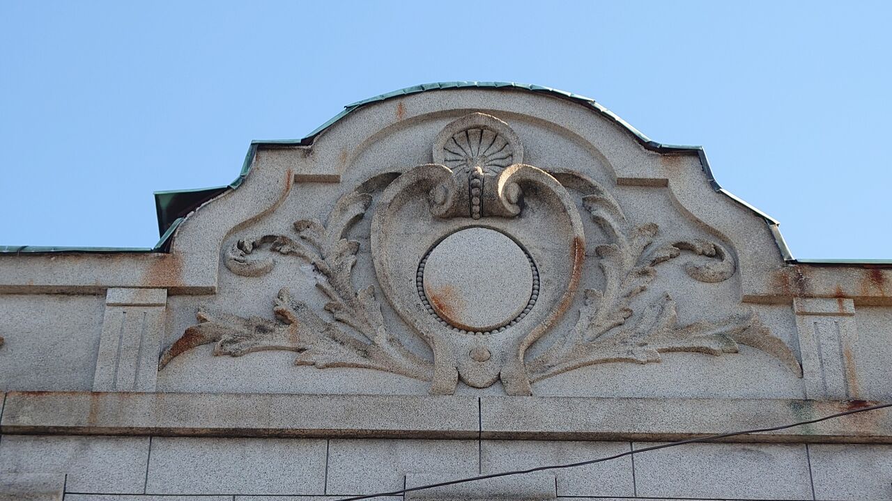 軒の装飾。ちなみに隣にも看板建築がありますが、改修中でした。