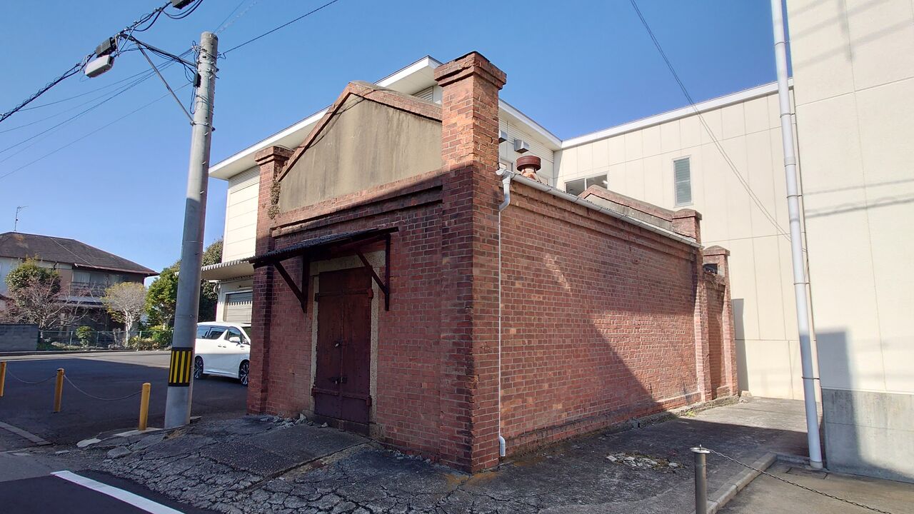 裏側。現在は大和産業の危険物倉庫となっていますが、倉庫の周囲が整備されているように見えます。現在の大和産業の前身が岡田燐寸製造所であり、もしかしたら記念碑的な感じで残しているのかもしれません。もしそうなら、説明板とか置いて欲しいですね。