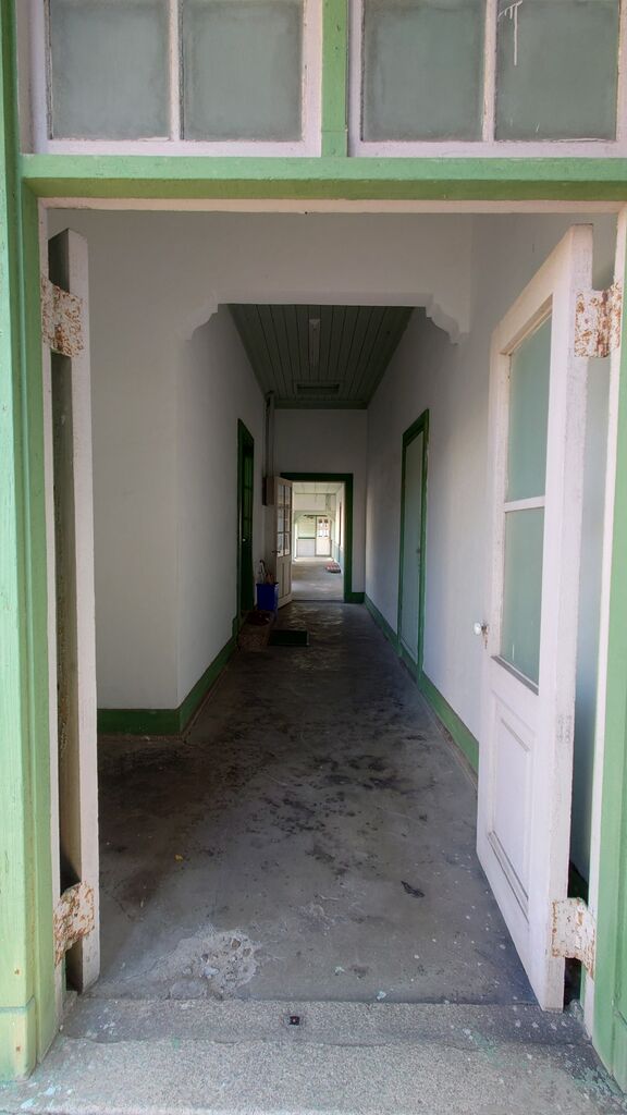 廊下。現在は東京電機工業の本館で、国登録有形文化財。