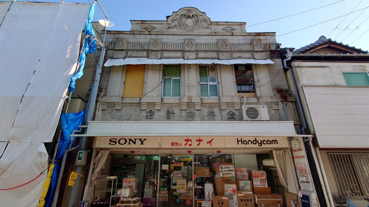 金井時計店。新在家。装飾に富んだ見ごたえのある看板建築。