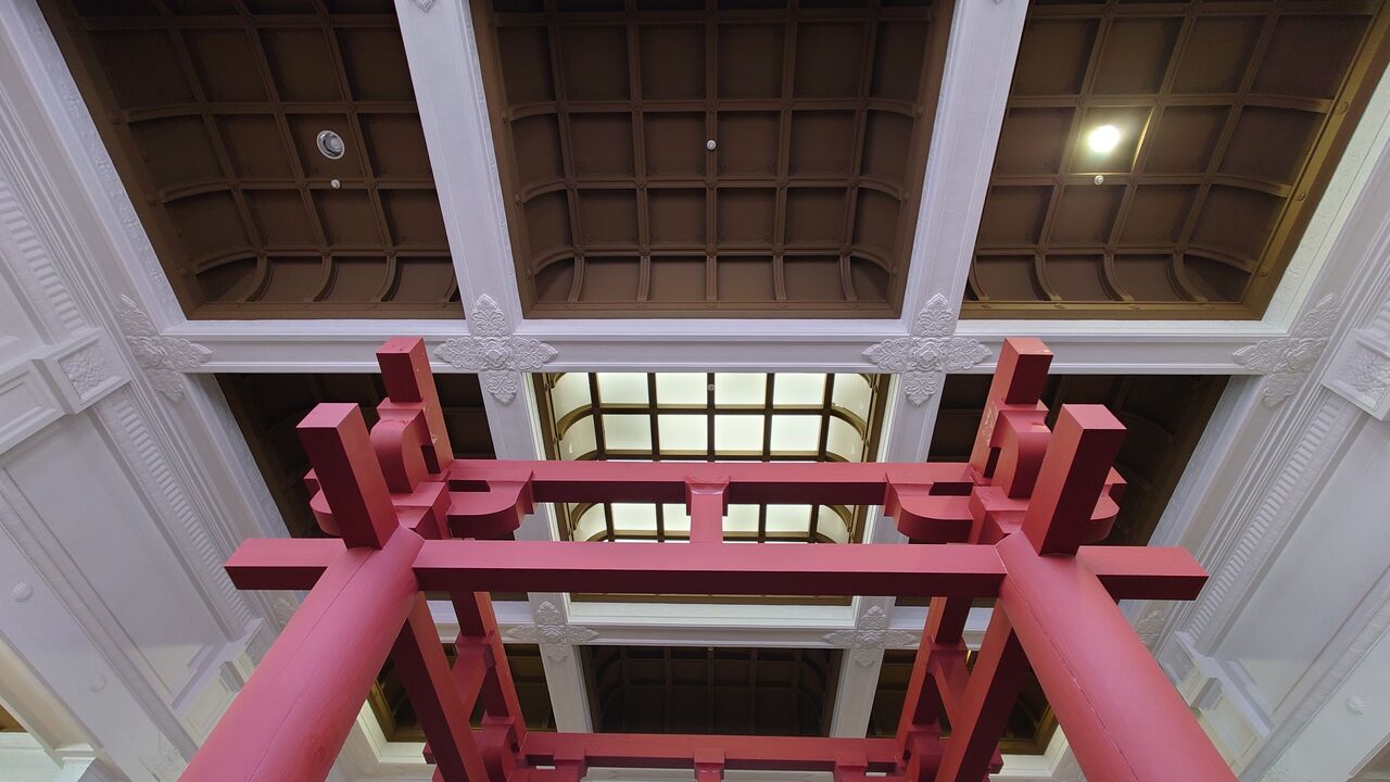 内部も和の要素を取り入れたデザインで、天井は折上格天井となっています。現役の頃に行ったことありますが、現在は観光案内所という性格か寺院建築の柱や梁を模したオブジェとかが置かれてちょっと邪魔かな・・・。ちなみに建物内にはスタバもありますので、一息つくにはいい感じの建物です。