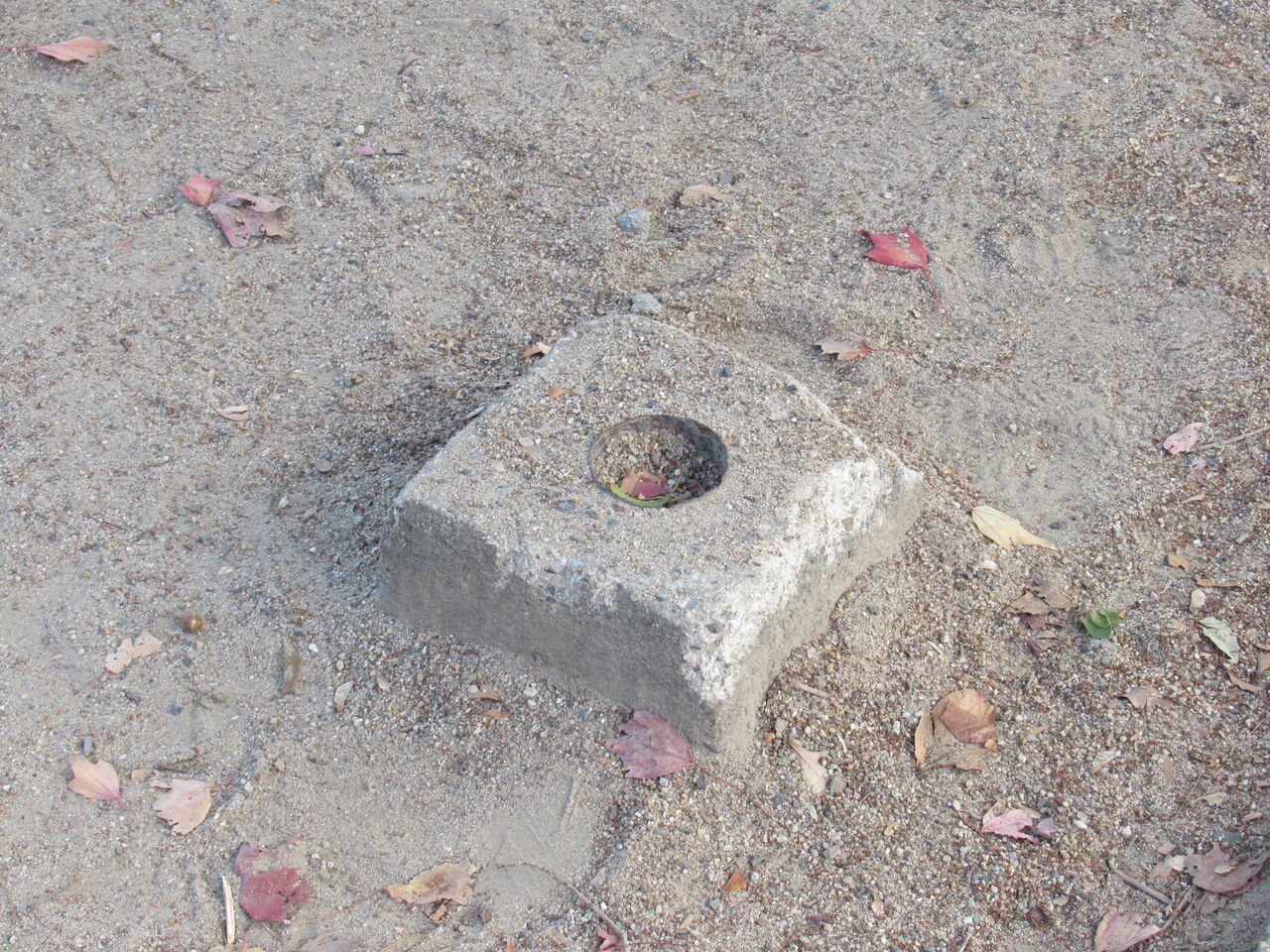 国旗掲揚台は背後に金属のポールを設置し、そのポールに国旗を掲げました。下鴨森ガ前児童公園の国旗掲揚台にはポールを固定する金具が今でも残されています。