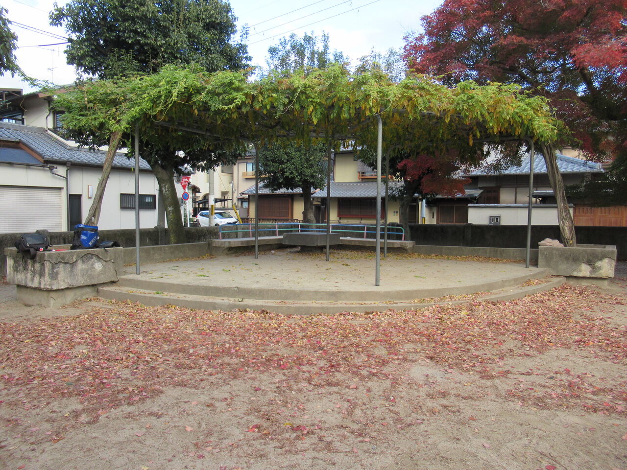 京都市内の戦前の児童公園には必ず藤棚のあるバーゴラが設けられていますが、規模の大小に限らず大抵は長方形で、この下鴨森ガ前児童公園のように扇形にしているのは珍しいです。