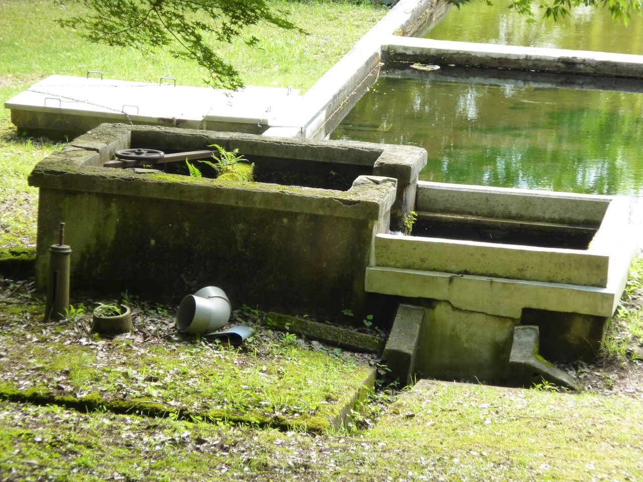 取水口堰堤の左端にある桝。その下には通水路があり、絵葉書にも写っているため当時のままのようです。