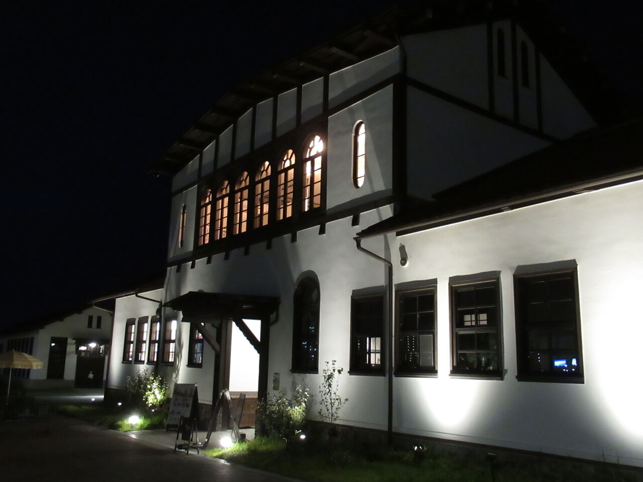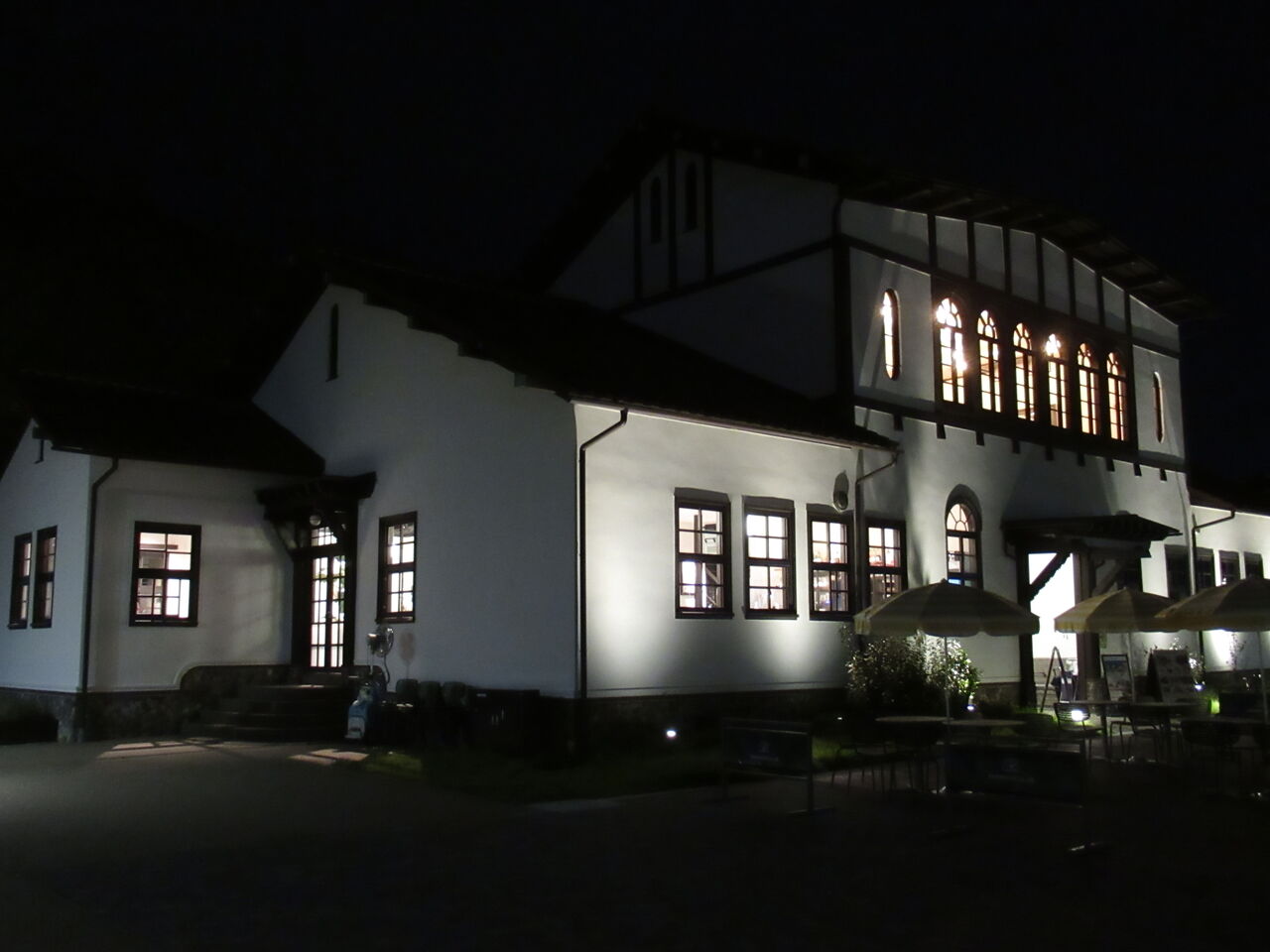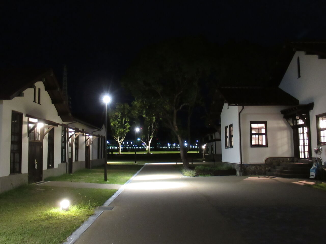 本館と蔬菜選別室との間。洋館の建ち並ぶこの一角の夜景は、まるで異国の夜の街並みに迷い込んだかのような雰囲気を味わえました。