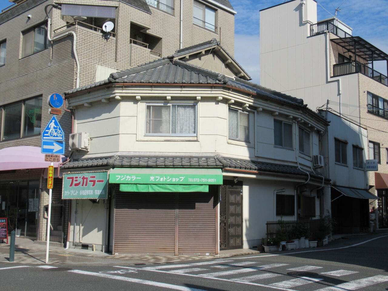 光フォトショップ。栄本町。角地に建つ看板建築。
