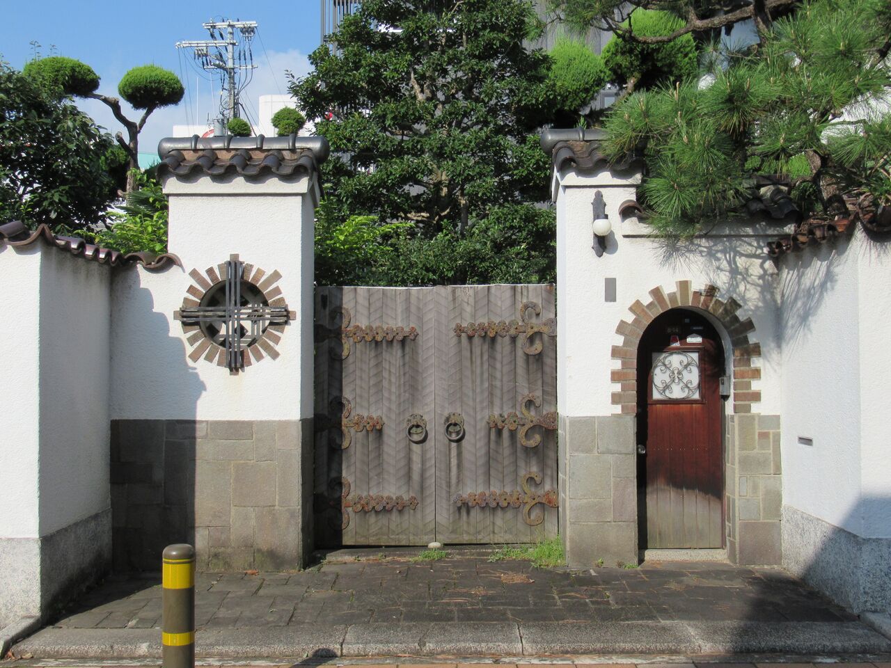 正門。住宅と同じスパニッシュ様式のデザイン。
