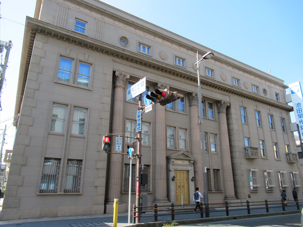 池田泉州銀行本店。城南2丁目。昭和27年。戦後建築ですが堂々たる古典様式の銀行建築。